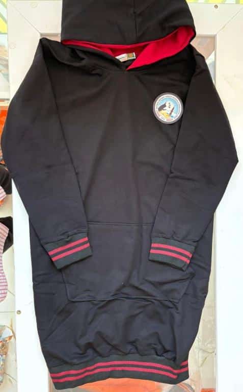 LİSE Forma: dize kadar uzun siyah kapşonlu tunik kolları kırmızı çizgi şeritli sol tarafta okulun arması